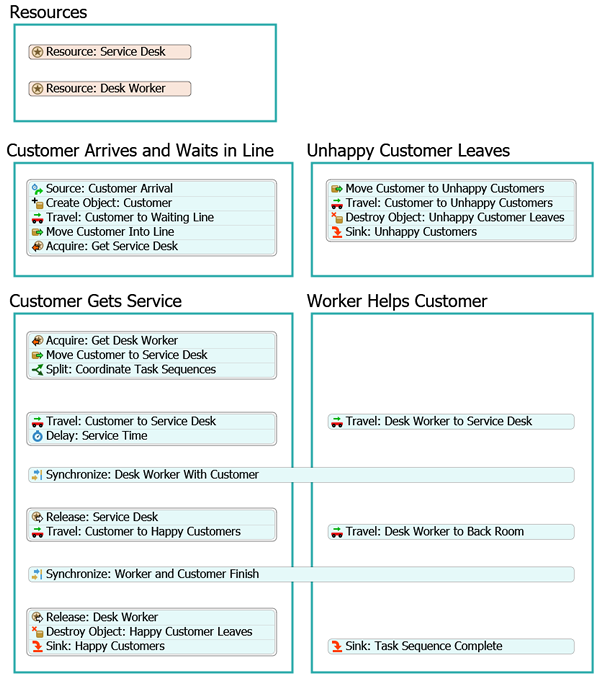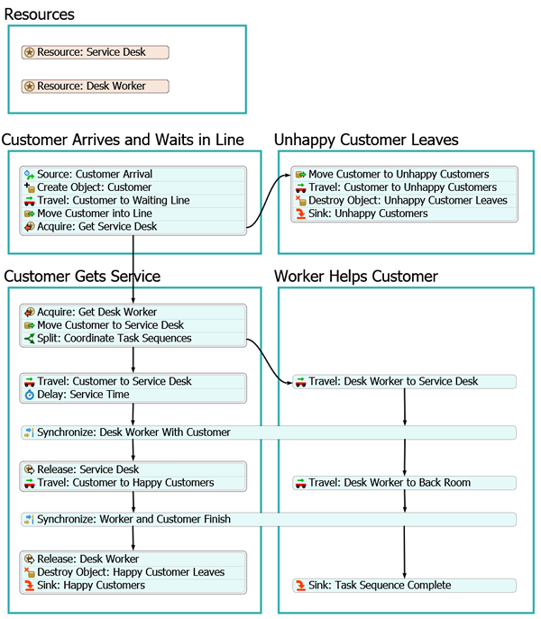 - 从Delay: Service Time(延迟:服务时间)活动引出连接线,连接至Synchronize: Desk Worker With Customer(同步:服务人员与客户)活动。