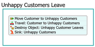 | Destroy Object: Unhappy Customer Leaves(销毁对象:不满意客户离开) | 该活动将把代表不满意客户的流项目从仿真模型中移除。 |