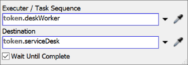 - 在Worker Helps Customer(服务人员提供服务)形状中,选中Travel: Desk Worker to Service Desk(移动:服务人员至服务台)活动,在属性面板中点击Executer / Task Sequence(执行器/任务序列)框旁的箭头打开菜单,指向Token Label(令牌标签)后选择deskWorker(服务人员)。