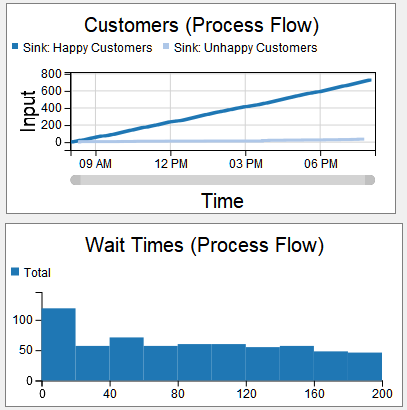 可以发现,添加额外的服务台后,原有的客户等待问题几乎得到彻底解决,满意客户与不满意客户的比例大幅优化,客户平均等待时间显著缩短。