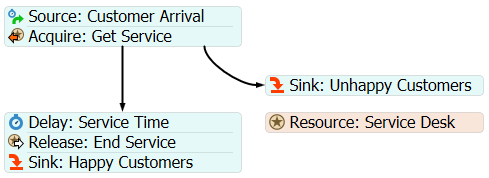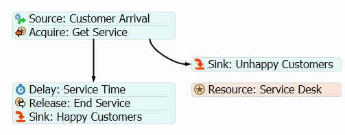 此活动将代表顾客排队等待服务台客服代表提供服务。如果代表正忙,顾客将排队等待,直到代表空闲。 为了模拟某些顾客在队伍过长时变得沮丧并离开,您将更改此活动的最大等待时间。如果顾客等待超过200秒,他们将变得沮丧。代表沮丧顾客的令牌将被发送到"不满意顾客"汇。 |