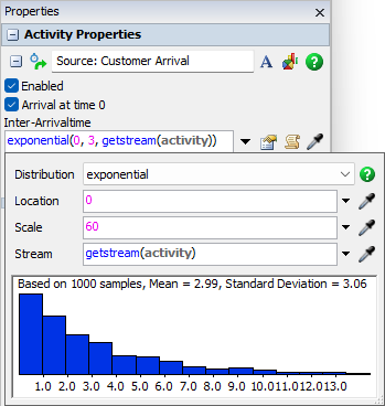 请注意,间隔到达时间已设置为使用指数统计分布,顾客平均每3秒随机到达一次。点击编辑属性按钮