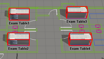 - 按住 Shift 键,同时使用鼠标在您在上一步添加到模型中的所有四个新ExamTable对象周围画一个框。一个红色框将出现在检查台周围,表示它们已被选中。