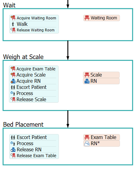 在此步骤中,您将使用"与工作人员一起处理"、"两名工作人员会面"和"护送至出口"活动集来模拟病人由 MD 检查、RN 和 MD 讨论病人,然后病人被护送至出口。我们还将看到如何引用在较早活动集中获取的资源。