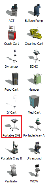 - 在库中的医疗保健组下,单击设备对象以打开位置对象菜单。将一个便携式心电图机对象拖入模型。