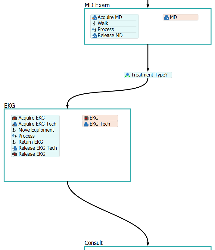 在此步骤中,您将学习如何在FlexSim医疗保健模型中处理设备。 您将添加一个治疗选项,其中一名技术员将从其 存储区获取一台心电图机并用它来测试患者。当患者完成测试后,技术员 会将心电图机送回其存储柜。