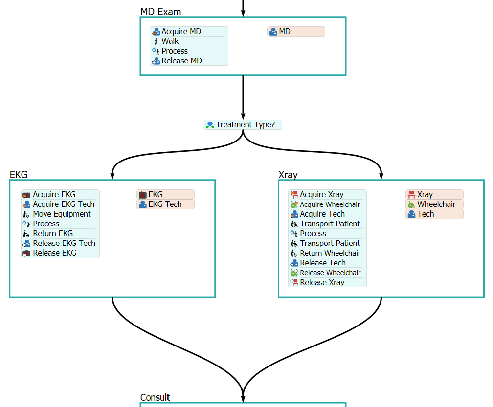 在此任务中,您将为患者构建两种不同的可能治疗路径。 这些不同的治疗路径将教您如何使用运输工具和设备, 它们是Flexsim医疗保健模型中的一类特殊对象。