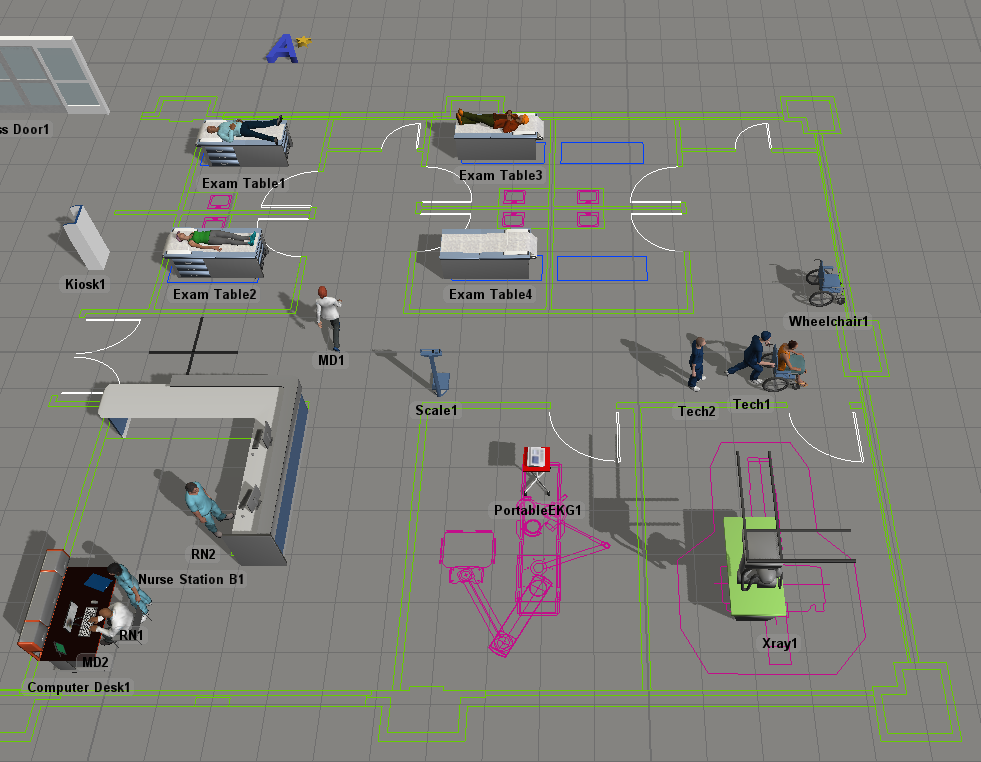 现在当您运行模型时,患者和注册护士不再穿过物体或墙壁。请注意,注册护士在带着患者前往患者生命体征区域时,会绕过办公桌和平面图中的墙壁。
