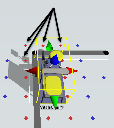 - 点击检查台1对象以选中它。注意,您现在可以看到该对象的移动阈值,由围绕该对象的几个红色和蓝色圆点表示。