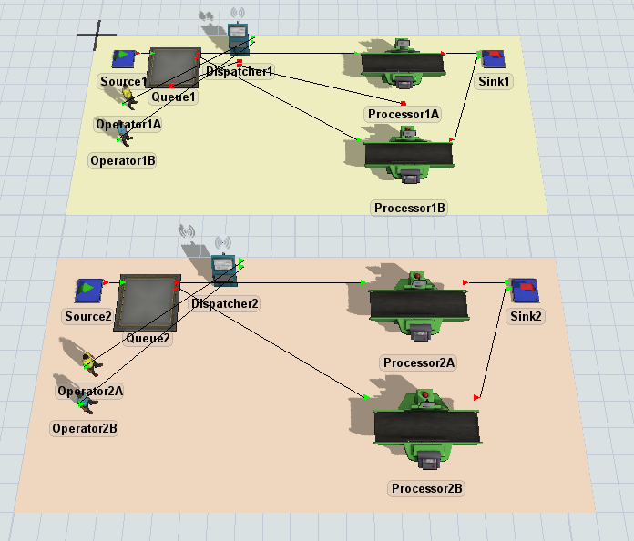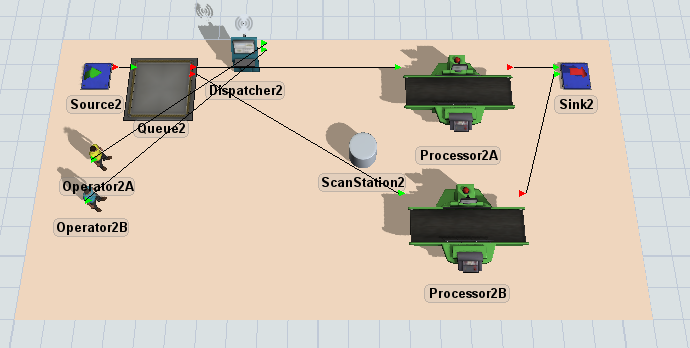 - 移除从调度器到队列以及从调度器到 Processor2B 的中心端口连接。(按住 'W' 键的同时单击并在两个对象之间拖动。)