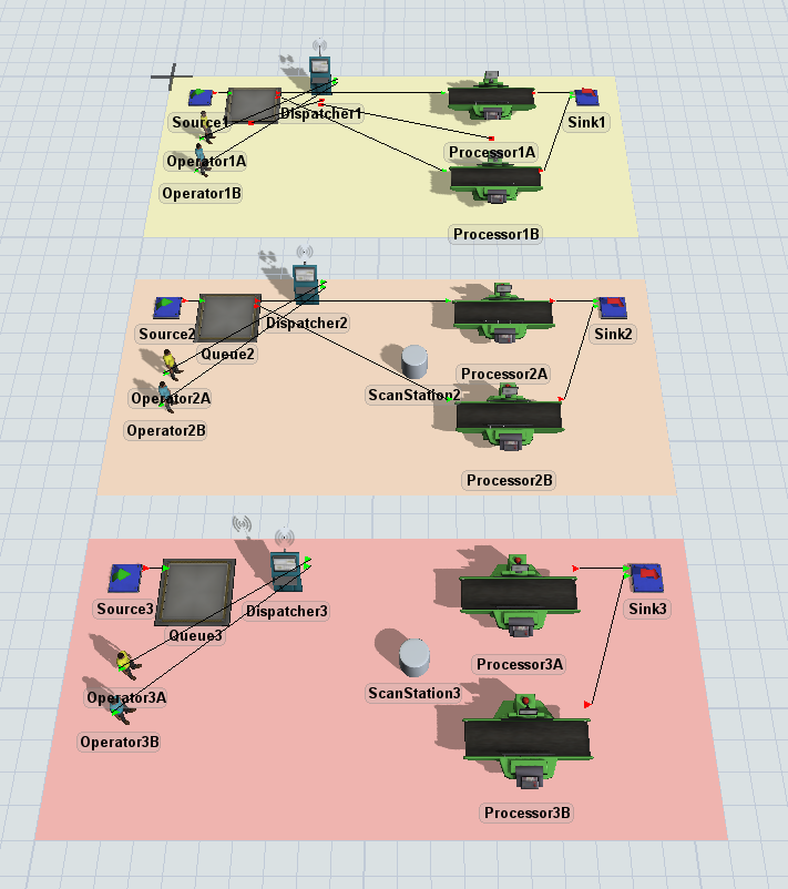 - 重命名复制平面上的每个 3D 对象,将名称中的任何2数字替换为3,例如Queue3、Operator3A、Processor3A等。