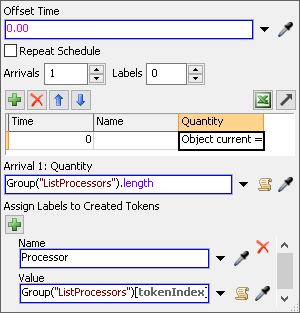 | 源:初始化处理器组 | 仿真开始时,此活动将为ListProcessors组中的每个处理器创建一个令牌。它将把处理器组的一个成员分配给每个令牌上的一个标签。 |