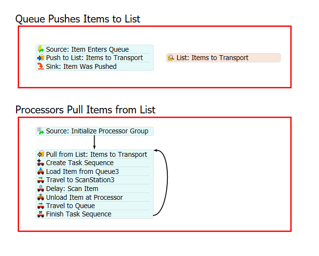 请注意,操作员总是优先运输红色紧急订单物品,然后再运输其他物品。如果他们不是立即拾取紧急订单物品,通常是因为紧急订单物品在操作员的令牌到达"从列表拉取"活动后才到达队列。