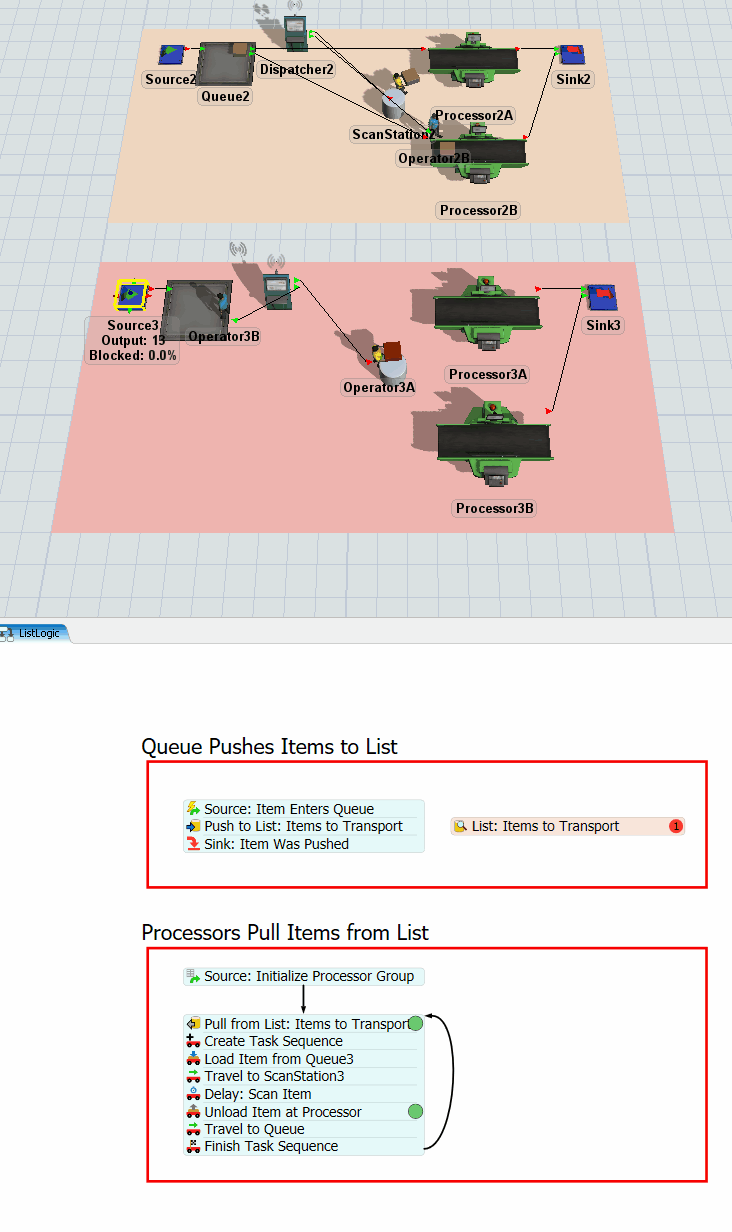 使用列表时需要注意的一点是,它们稍微复杂一些,因为您通常要处理多个流。这里的术语流指的是将在流程流中移动的两个不同的令牌流。一个令牌流将管理 3D 模型中的项目流,在它们准备好运输时将其推送到任务列表。另一个令牌流将管理 3D 模型中的操作员流,指示他们从列表中拉取项目并完成一系列任务。