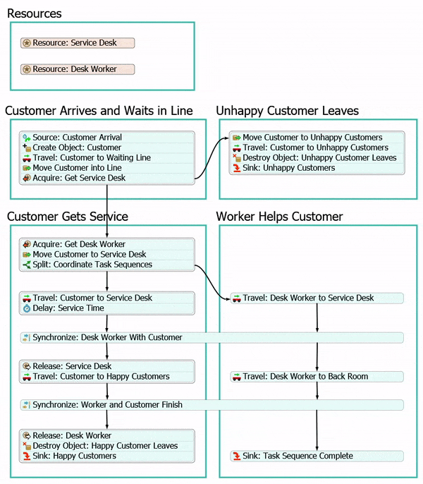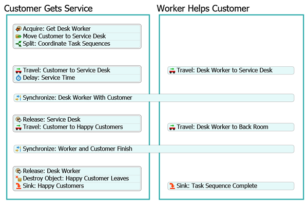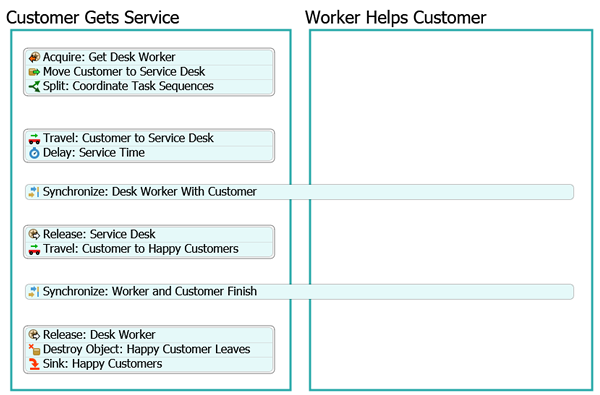 - 从Delay: Service Time(延迟:服务时间)活动引出连接线,连接至Synchronize: Desk Worker With Customer(同步:服务人员与客户)活动。