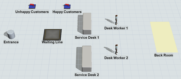 本步骤中,你将为3D模型添加若干新对象,包括两个视觉对象(作为客户服务中心入口的形状对象、代表服务中心后台区域的平面对象),以及一个额外的服务台和两名服务人员,为客户提供服务支持。通过添加额外服务台,你可以研究满足客户需求所需的最佳服务台数量和员工配置。