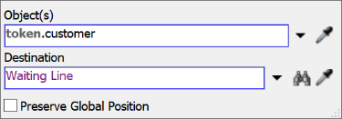 - 选中Move Customer to Waiting Line(将客户移至队列)活动,在属性面板中点击Object(s)(对象)框旁的箭头打开菜单,指向Token Label(令牌标签)后选择customer(客户)。