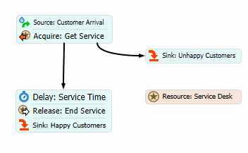 | 汇:不满意顾客 | 此活动将从模型中移除令牌(顾客),并跟踪通过此特定汇退出流程流的顾客数量。换句话说,它将跟踪变得沮丧并离开的顾客数量。 |