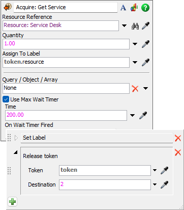 按钮。点击释放令牌选择列表旁边的箭头以打开其选项。在目标框中,输入2。此设置将把达到最大等待时间的顾客(令牌)发送到第二条连接线,该连接线连接到不满意顾客活动。