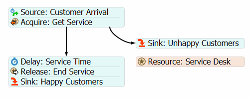 此活动将代表顾客排队等待服务台客服代表提供服务。如果代表正忙,顾客将排队等待,直到代表空闲。 为了模拟某些顾客在队伍过长时变得沮丧并离开,您将更改此活动的最大等待时间。如果顾客等待超过200秒,他们将变得沮丧。代表沮丧顾客的令牌将被发送到"不满意顾客"汇。 |