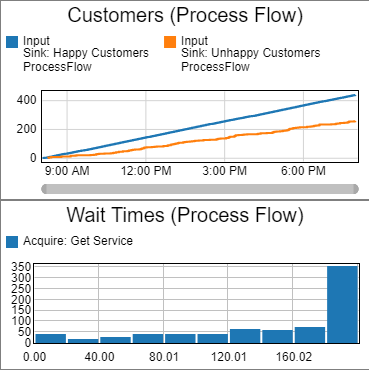 与3D模型的结果类似,您会注意到满意顾客仅比不满意顾客略多,这不是一个好迹象。同时请注意,平均等待时间非常接近200秒的最大等待时间。显然,这是一个可以改进的业务流程。