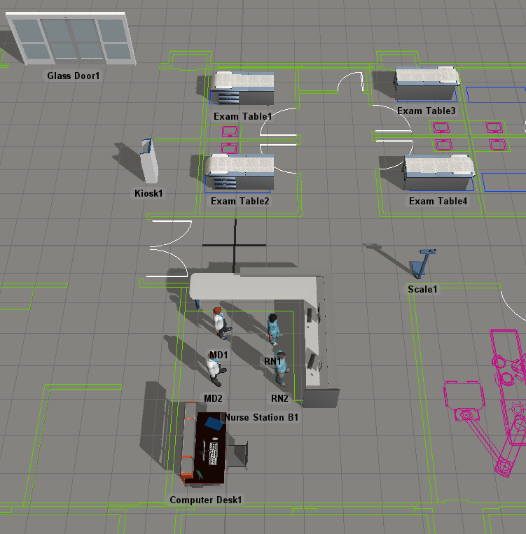 由于您在上一步中向仿真模型添加了几个新的 3D 对象,您需要为这些新对象创建对象组,以便使您的模型具有良好的可扩展性。在此步骤中,您将为新的检查台创建一个名为ExamRooms的位置组,并为 MD 和 RN 工作人员创建名为MDs和RNs的工作人员组。