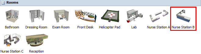 - 在库中,位于Healthcare组下,点击Prop对象以打开道具对象菜单。将一个Nurse Station B(在Rooms组下)拖入 3D 模型。