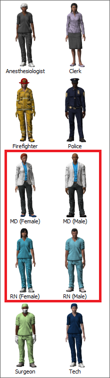 - 在库中,位于Healthcare组下,点击Staff对象以打开工作人员对象菜单。将一个MD (Female)和一个MD (Male)拖入模型。