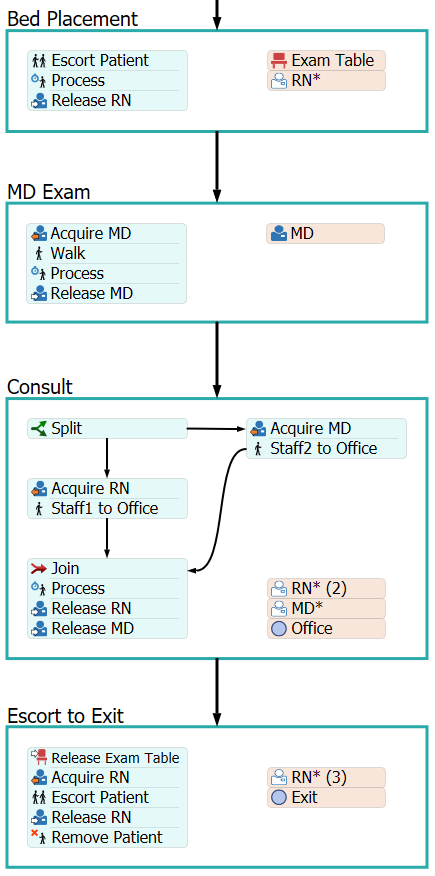在此步骤中,您将使用"与工作人员一起处理"、"两名工作人员会面"和"护送至出口"活动集来模拟病人由 MD 检查、RN 和 MD 讨论病人,然后病人被护送至出口。我们还将看到如何引用在较早活动集中获取的资源。