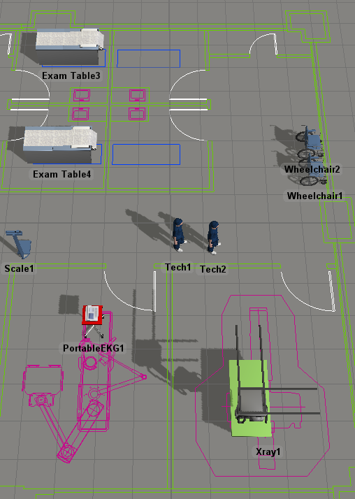 在此步骤中,您将向3D模型添加额外的位置对象和人员对象。 您还将在模型中添加一些运输对象(轮椅)和一个设备对象(心电图机)。