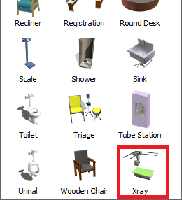 - 在库中的医疗保健组下,单击位置对象以打开位置对象菜单。将一个X光对象拖入模型。(使用本步骤开头的图片 作为对象放置的指南。)