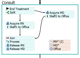 - 在PatientFlow流程流中,按住Shift键,同时使用鼠标 在会诊和护送离开容器周围画一个框。容器将高亮显示 黄色以表示它们已被选中。