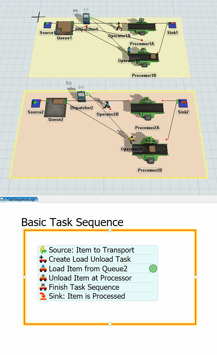 - 框中输入token.Processor。重置并运行模型:与操作员使用标准 3D 对象逻辑工作的方式类似,使用流程流的操作员将把到达的流物品运输到处理器。您还会注意到,流程流中的令牌代表了流物品在运输任务中的移动。