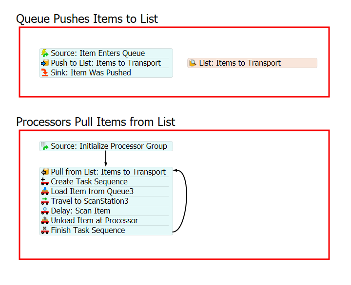 使用列表时需要注意的一点是,它们稍微复杂一些,因为您通常要处理多个流。这里的术语流指的是将在流程流中移动的两个不同的令牌流。一个令牌流将管理 3D 模型中的项目流,在它们准备好运输时将其推送到任务列表。另一个令牌流将管理 3D 模型中的操作员流,指示他们从列表中拉取项目并完成一系列任务。