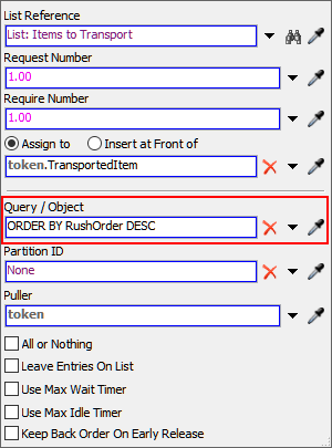 - 按钮保存更改并关闭窗口。在ListLogic流程流中,点击从列表拉取:待运输物品活动以选中它。在属性面板中,点击查询/对象框旁边的箭头打开菜单。指向ORDER BY (排序)并选择RushOrder。在现在显示在此框中的查询里,将ASC更改为DESC