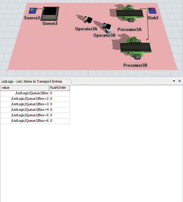 请注意,操作员总是优先运输红色紧急订单物品,然后再运输其他物品。如果他们不是立即拾取紧急订单物品,通常是因为紧急订单物品在操作员的令牌到达"从列表拉取"活动后才到达队列。